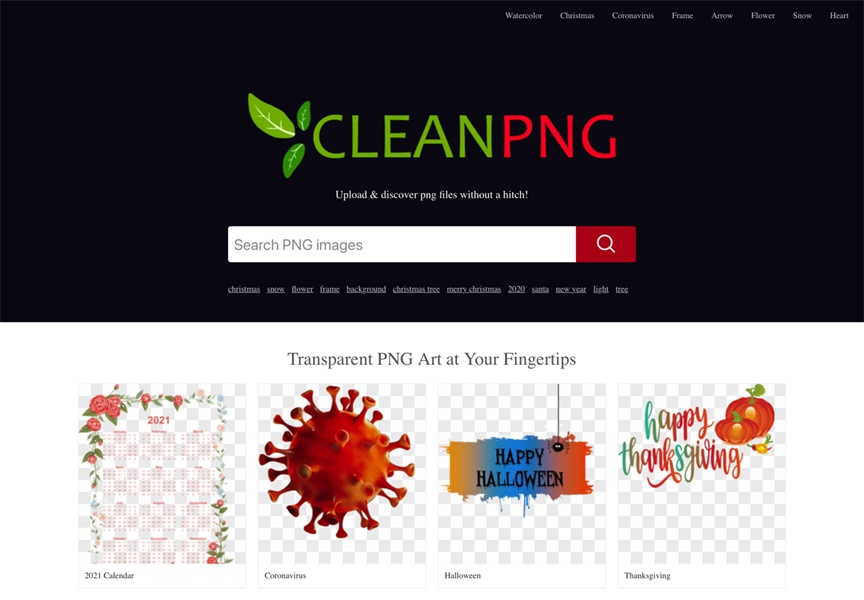 开启 CleanPNG 网站后会看到一些随机挑选的透明背景图 PNG 素材,上方也会有分类选单、搜寻框和一些热门关键词,可直接输入想搜寻的图案,若没有想法的话就从首页点选素材开始浏览。